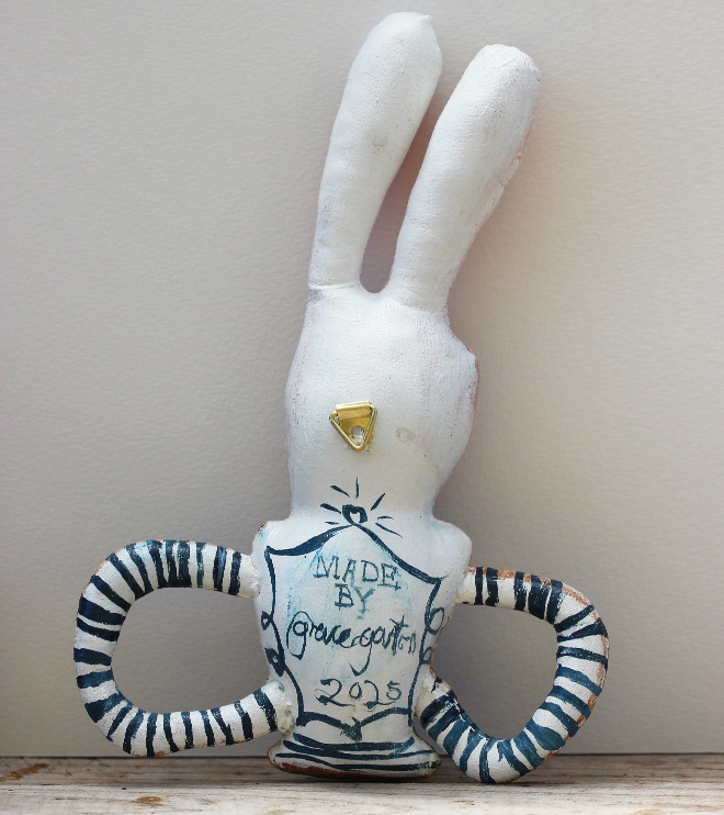 This is a soft sculpture art work painted with acrylics and varnished, The small cracks on the surface are intentional, to give a vintage feel. This piece features Alice with a set of bunny ears and her arms transformed into handles. A painting of a ship is illustrated on the front, giving the impression of vintage china.