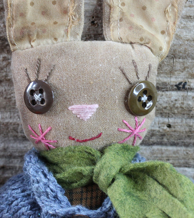 Her cardigan is made from recycled denim and is a blue grey yarn and her green scarf is 100% wool felt.