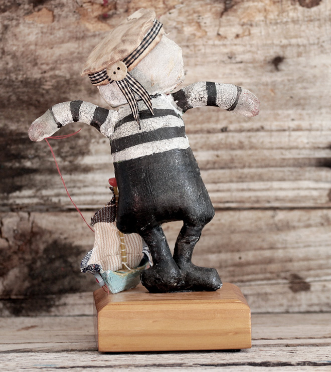 graphite, acrylic, paper mache, vintage fabric