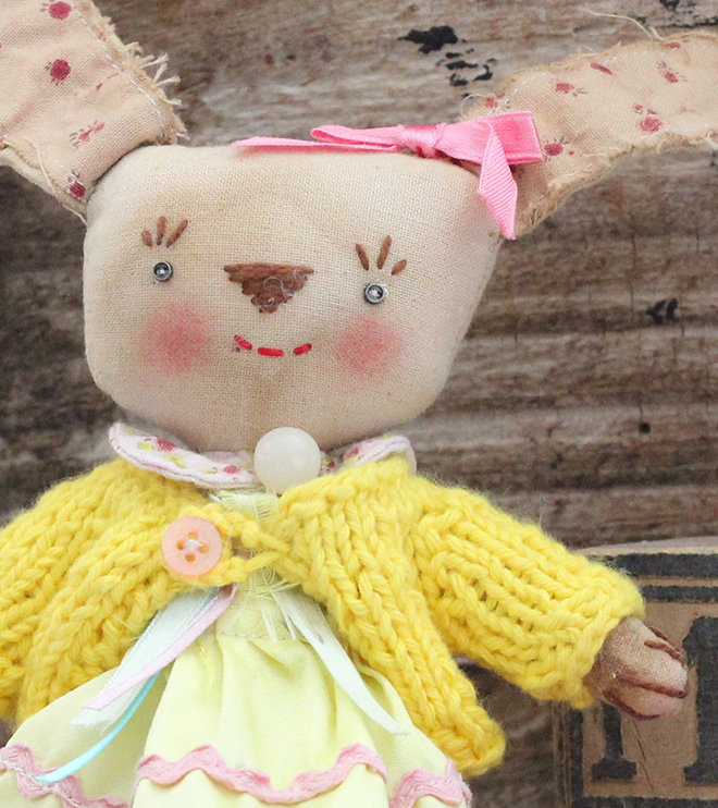 Her eyes are made from two small metal buttons and the vintage buttons on her dress are pastel pink in colour.