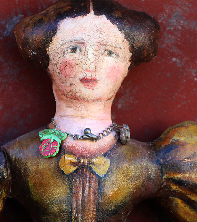 The figures are made from calico and stuffed with fabric and fiber fill. Painted with acrylic, distressed and glazed.and finished with a gloss varnish.
