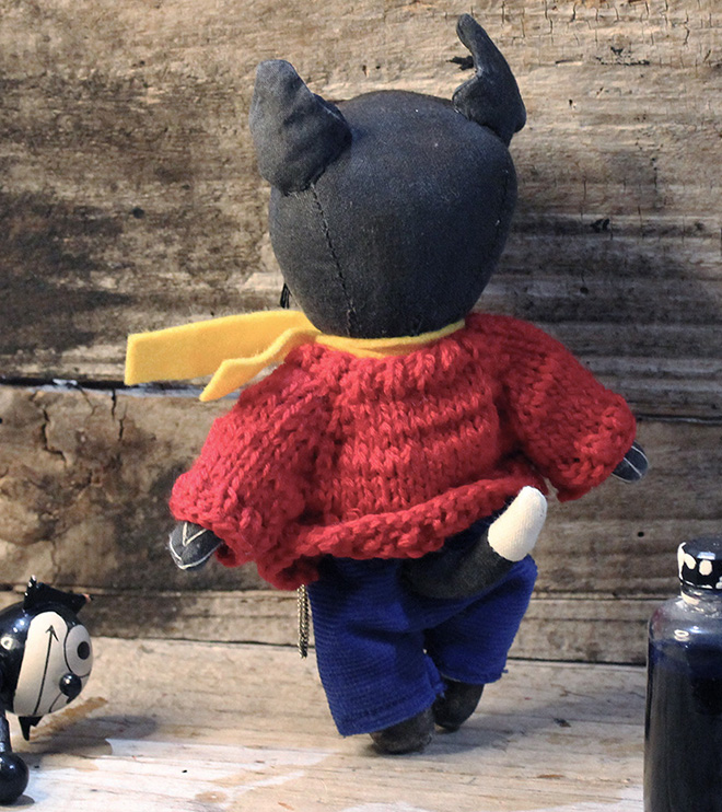 His jumper red wool and his yellow scarf is 100% wool felt.