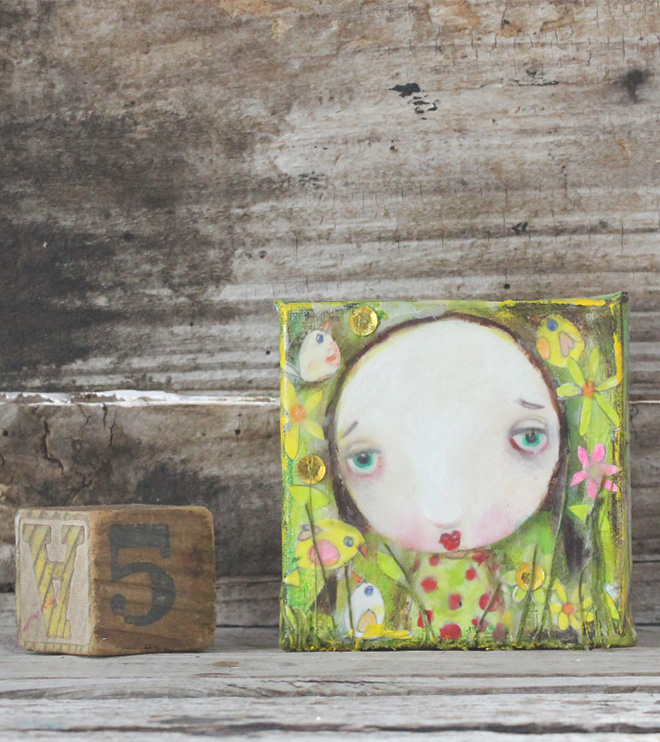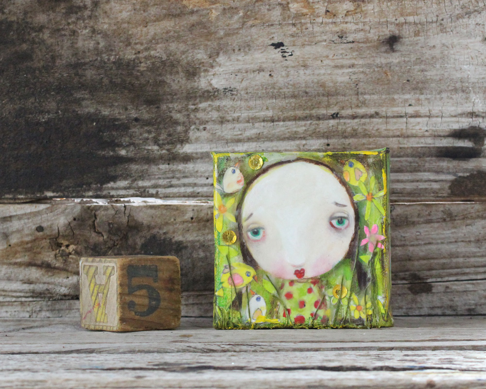 Painting depicts a young girl listening the cacophony of birds and surrounded by the bright fresh spring green foliage and colourful blossoms.