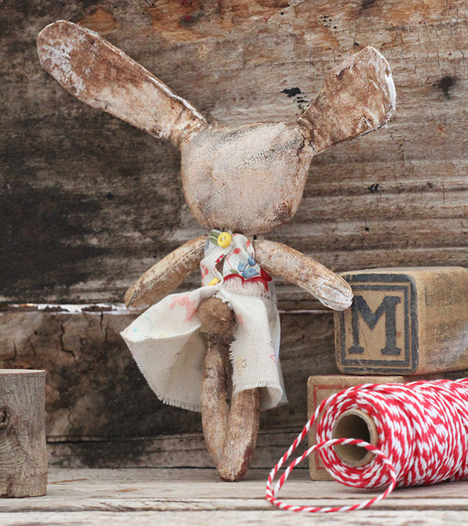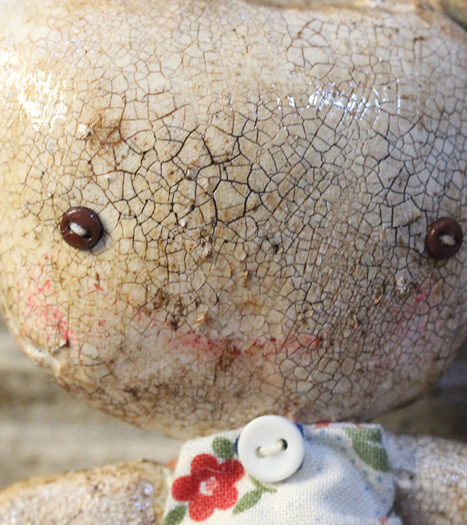 Winter is a white vintage style bunny. She has two tiny brown button eyes and a barely there drawn on smile.