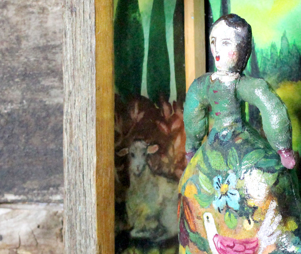 One new work that I am immensely happy with how it turned out is the above work, titled, Lady Greensleeves. It’s a small painted fabric doll inside a shadow box that I have lined with watercolour illustrations. The watercolours have been sealed in a wax varnish.